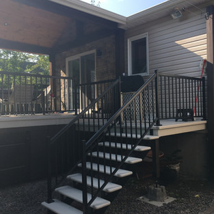 Projet de rénovation et construction d'un balcon, ajout d'un toit et escalier et accessoires. Finition et ajout de pierre près de la porte patio. Ajout d'éclairage sur la toiture.